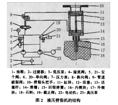 如图2为JQ系列液压分裂机的结构组成及工作原理。该机由动力供给系统(泵站)、控制元件、液压管路、液压缸、楔块组件等构成。工作时,泵向系统提供高压油,经控制元件、液压管路而进人液压缸的无杆腔,推动活塞向下运动,通过楔块组件的放大将纵向的推力转化为横向的劈裂力,使矿岩分开。
