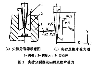 图3为尖劈分裂器和尖劈及楔片受力图。如图3-a所示,与液压分裂机活塞相联的尖劈并不直接劈裂岩石,而是在尖劈两侧还有一对楔形片,即两楔片夹着尖劈组成一个40mm的圆柱体一分裂器。在预定的岩石分裂线上事先钻若干中40mm的孔,然后将分裂器分别插人这些孔内,当液压分裂机通人高压油后即可在上述孔内同时产生劈裂力,致使岩石按预定的位置和方向裂开。