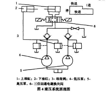 液压系统是分裂机的核心部分,系统的结构和性能分裂机工作安全性、可靠性、生产力具有重要影响。JQ系列液压分裂机液压系统如前所述,该分裂机有上、下两个油缸。上油缸有空行程快进、劈裂工进和快退三个动作。据此,设计了双泵液压系统,见图4。