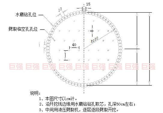 测量放线、布孔由测量人员根据隧道洞内控制导线,精确测设出非爆开挖断面的圆心,然后再在掌子面上画一个半径1.5m的圆。水磨钻钻孔孔位可沿轮廓线连续布臵。由于水磨钻行程仅有60cm,有效成孔深度在50cm左右,需多次钻孔才能达到非爆区的设计循环进尺,水磨钻钻孔需存在一定外插角,若开孔处采用相切圆,则在孔位末端存在楔形岩体,断面不连续,因此,开孔时采用咬合圆的型式,消除孔末端的楔形岩石,形成连续的临空面。中部用于劈裂的钻孔孔间距40cm、排距40cm,沿隧道中线呈梅花形左右对称布置。 沿开挖线边缘用水磨钻钻孔取芯,孔深50cm左右;中间用液压分裂机,逐层逐段劈裂开挖。水磨钻孔位劈裂临空孔孔位,搭设简易台架 用于钻孔和劈裂的台架采用脚手架搭设。台架顶部非爆开挖区高80cm、宽2m(左右侧各1m)左右,以便于人员操作和水磨钻悬吊。 台架搭设应牢固,强度和稳定性满足要求,尽量减少作业的晃动,保证施工安全和试钻精度。