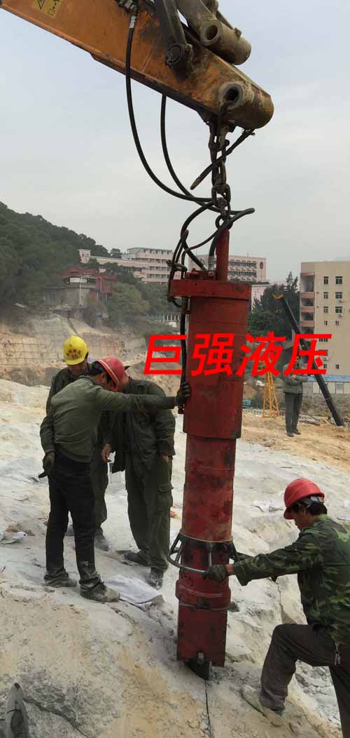 超大型机载劈裂机 国内首家设计生产大型机载劈裂机的公司,现已成功上市销售多年且获得客户认可。 巨强机载劈裂机的工作原理:在预钻孔插入劈裂头,液压缸压出劈裂头之间的中心楔子,楔子扩张劈裂块(把轴向力转为横向力),岩石被强制破解。